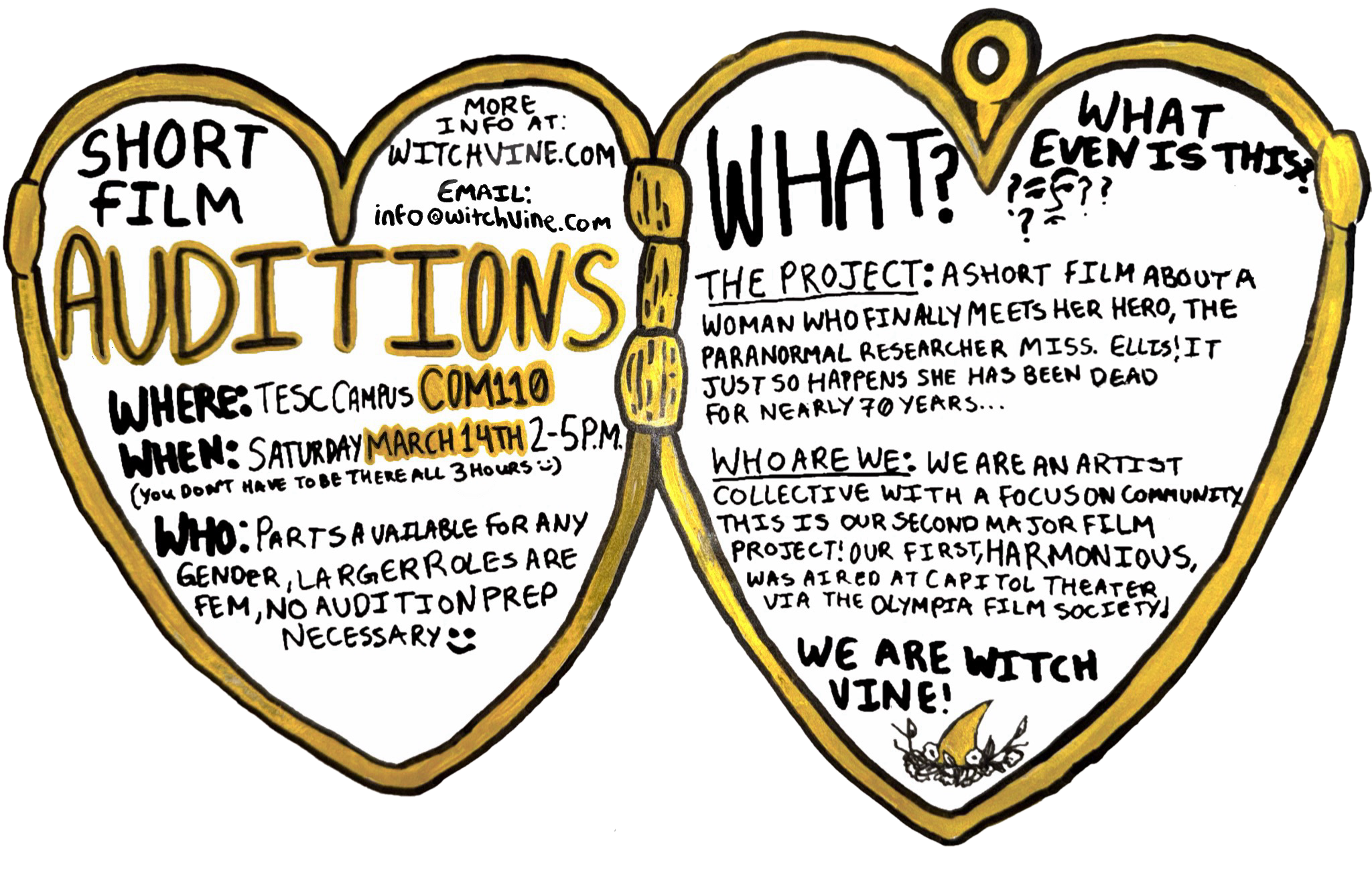 Auditions are being held at the Evergreen State College campus in the Communications building room COM110, Saturday March 14th 2026 2-5pm. (You don't have to be there all 3 hours)